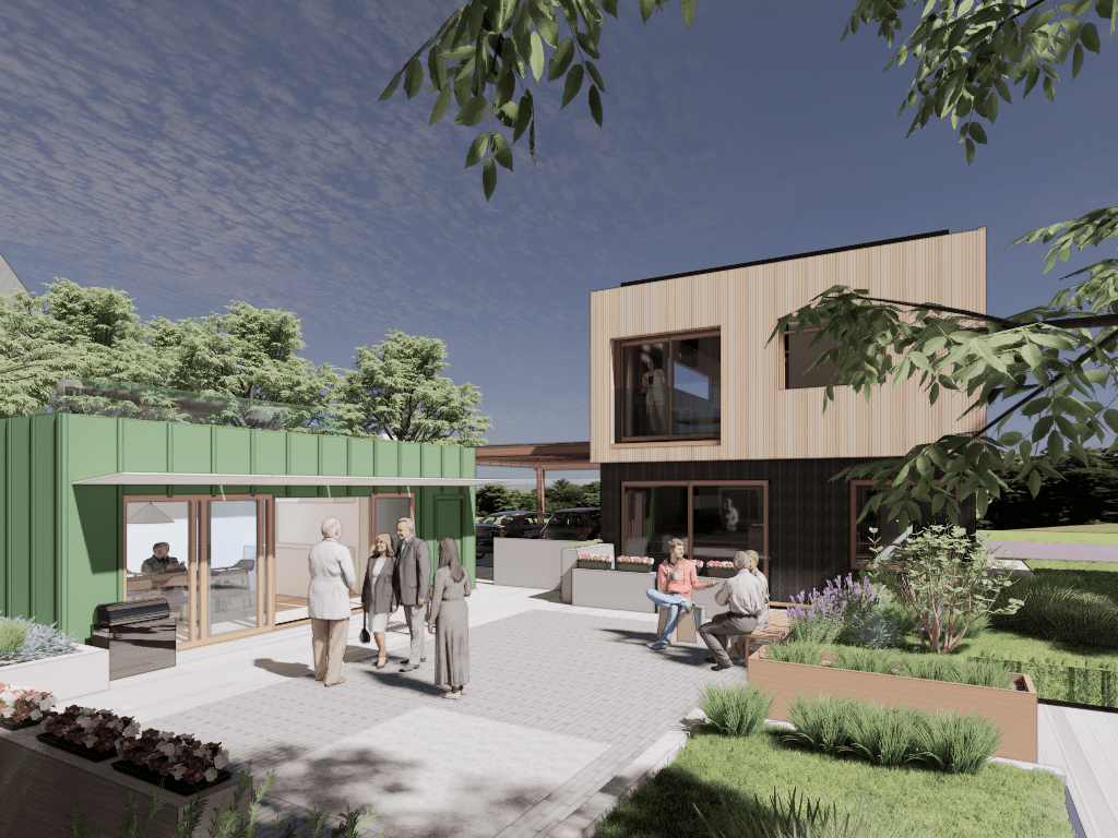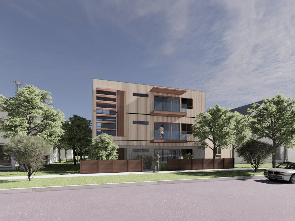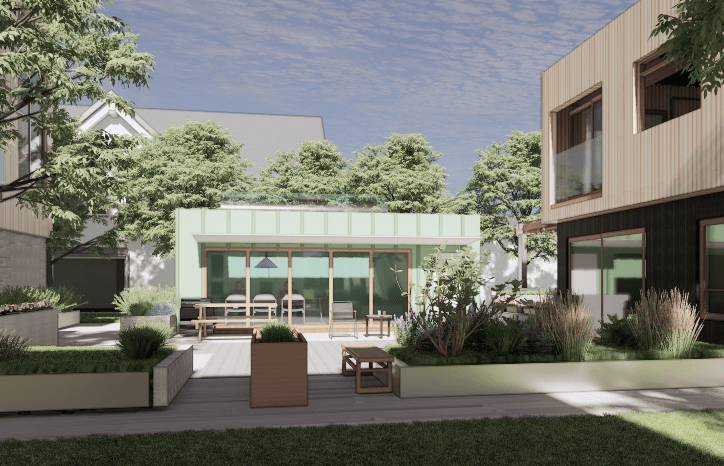 Co-housing around a common courtyard. Our proposal call for 3 storey at front, each unit 900SF and one level. At the back is a laneway 2 storey each about 600SF where caretaker or young family can live to take care of yard and maintenance. A car port for 2 electric cars that can be reserved makes sure everyone is mobile. A common house with kitchen and dining area for common dinners is the feature of the courtyard.